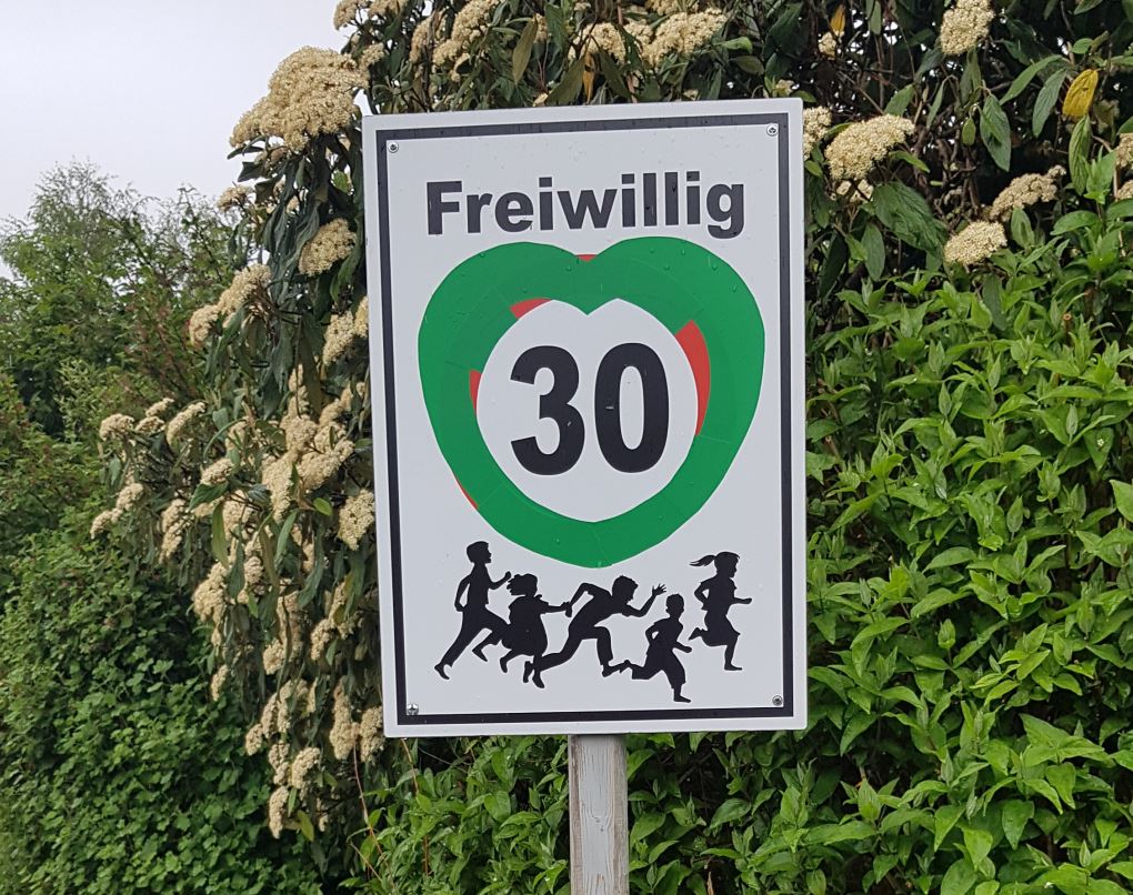 Nun hat das Gericht entschieden - leider nicht für die Menschen vor Ort. Denn auch das im Foto gezeigte Schild "Freiwillig Tempo 30" mit dem grünen Herz ähnelt dem Gericht zu stark einem offiziellen Verkehrsschild. Darüber kann man eigener Meinung sein :)