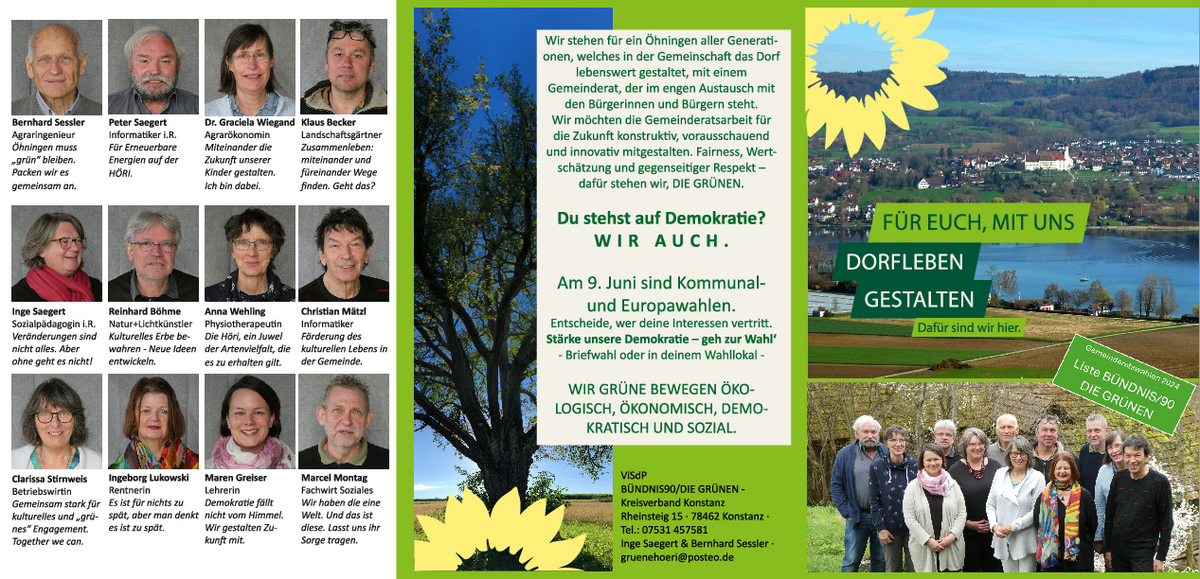 Bei der Wahl zum Öhninger Gemeinderat 2024 treten wir erstmals mit einer eigenen Liste an und sind wirklich stolz darauf. „Wir wollen die Kommunalpolitik Öhningen, Schienen und Wangen aktiv mitgestalten“, so die Vorsitzenden der Grünen Höri aus Öhningen Inge Saegert und Bernhard Sessler, und zwar gemeinsam mit den Bürgerinnen und Bürgern.“