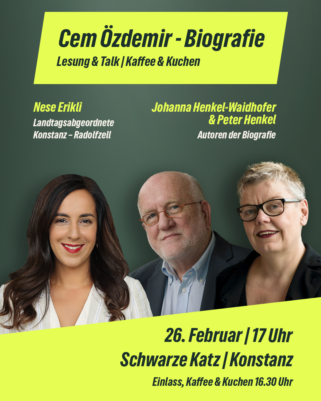 Die beiden haben Cem über Jahre begleitet und geben Einblicke in seinen Werdegang als Politiker, Vater und Brückenbauer. Wir beginnen um 16.30 Uhr mit Kaffee und Kuchen in der Schwarzen Katz (Katzgasse 8 in Konstanz). Die Lesung startet im Anschluss um 17 Uhr. Aufgrund begrenzter Platzkapazitäten wird um vorherige Anmeldung unter post@nese-erikli.de gebeten.
